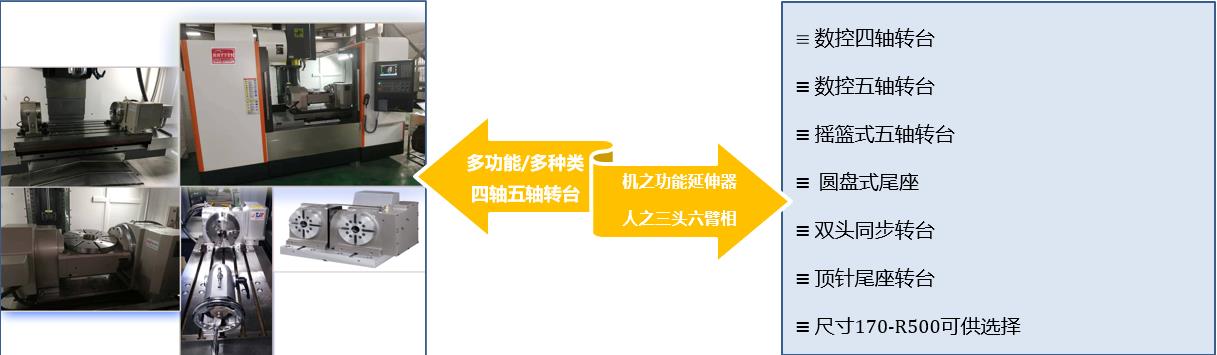 上海芮泰加工中心根据客户的不同需要,为机床配置了各类数控四轴转台,五轴转台,双头同步转台,顶针式尾座,圆盘式尾座等。其尺寸可从R170到R500以供选择。多功能,多种类,多样化的转台可以广泛应用于不锈钢,铸铝,铸铁,铜件,钢件,有色金属件,整机,钢结构,模具,手板,非标模型,塑料,轴承,轴套件,箱体,模架等加工中,为零件多工作面的铣、钻、镗、铰、攻丝、两维、等多工序加工, 具有在一次装夹中完成箱体孔系和平面加工的良好性能提供了保障。真正能做到“一次夹装,自动完成”的生产流程,使工件具有更高精度,更好的表面光洁度,在市场上具有更大的竞争力。
